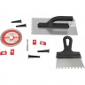 В одной упаковке собраны все необходимые инструменты для работ по укладке плитки. Шпатель и гладилка помогают подготовить поверхность для установки плитки: нанести сухую строительную смесь и равномерно ее распределить. Полотно инструментов из нержавеющей высоконагартованной стали достаточно прочное и упругое, не деформируется во время работы. Благодаря невесомому пластиковому корпусу и удобным ручкам, работать легко и приятно даже продолжительное время. Обработать плитку перед укладкой помогают специальное сверло и алмазный диск. Они легко режут и сверлят материал, избегая растрескивания и сколов. Диск также подходит для природного, искусственного камня, армированного бетона, кирпича (во время работы должен охлаждаться водой). В наборе предусмотрена система выравнивания плитки толщиной до 12 мм. Она помогает даже новичкам не допускать перепадов поверхности, оформить симметричные ровные стыки.